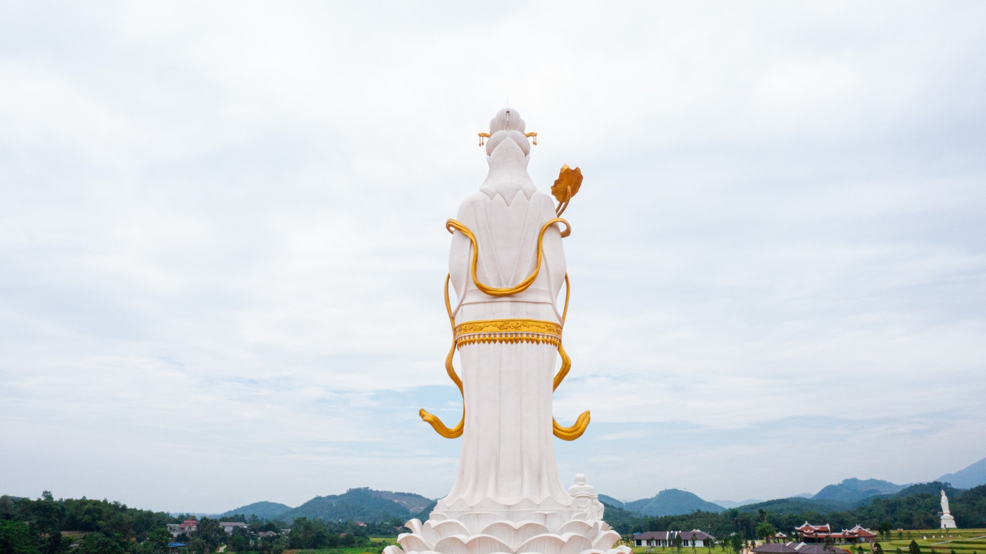 Ở giữa trung tâm đồi Thiên Đức là Tượng Bồ Tát Quán Thế Âm. Từ xa, quý khách có thể nhìn thấy bức tượng màu trắng xen lẫn vạt vàng, đó chính là tượng Quán Thế Âm, với vị thế trang nghiêm, vững chãi, nổi bật trên nền xanh thẳm của đồng núi Tuyên Quang. Dáng đứng của Tượng Phật cũng mang nhiều ý nghĩa đặc biệt, đôi mắt nhìn thẳng ra xa tượng trưng cho lòng từ bi, hỉ xả. Tay phải bắt ấn tam muội mang ý nghĩa cứu độ chúng sanh, còn tay trái cầm bình nước cam lồ giúp đem lại bình an.