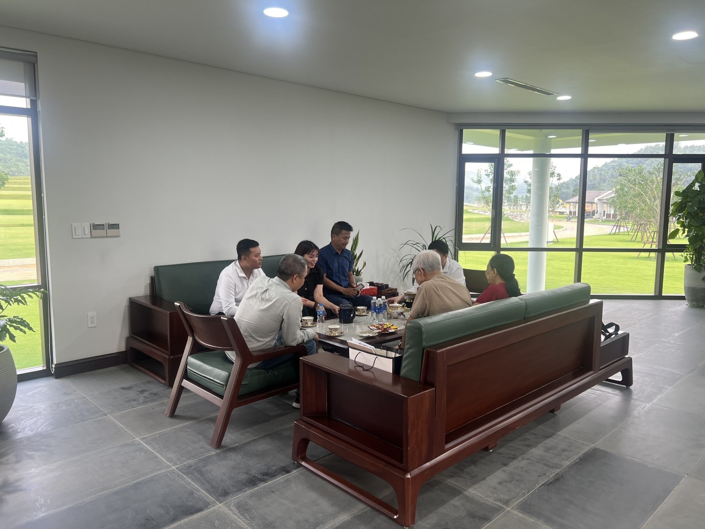 Khách hàng nghỉ ngơi dùng trà, bánh tại văn phòng tiếp đón